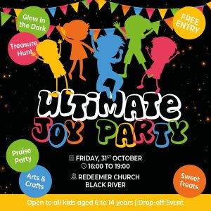 Join us for our Ultimate Joy Party on Friday, the 31st of October, from 16:00 to 19:00 at Redeemer Church. We will be having lots of fun, including glow-in-the-dark fun and a praise party. And of course, there will be lots of yummy eats and treats.